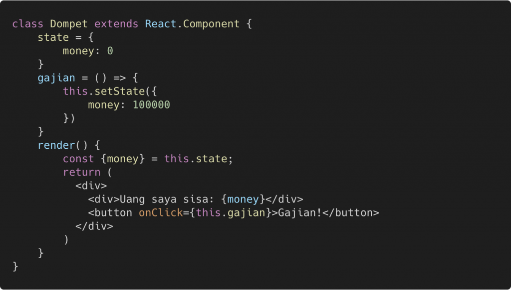 Data money yang ada di dalam state hanya relevan terhadap component Dompet itu sendiri. Kita dapat mengubah nilai dari sebuah state dari dalam component itu juga, seperti yang dilakukan oleh fungsi gajian().